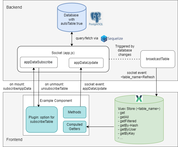 sendTableand emits<tableName>Refreshto the Vuex Store (right) with the current rows. The same event name is used later for updates.Socket write (optional; bottom-left “Example Component” → center “Sockets”): The frontend emits