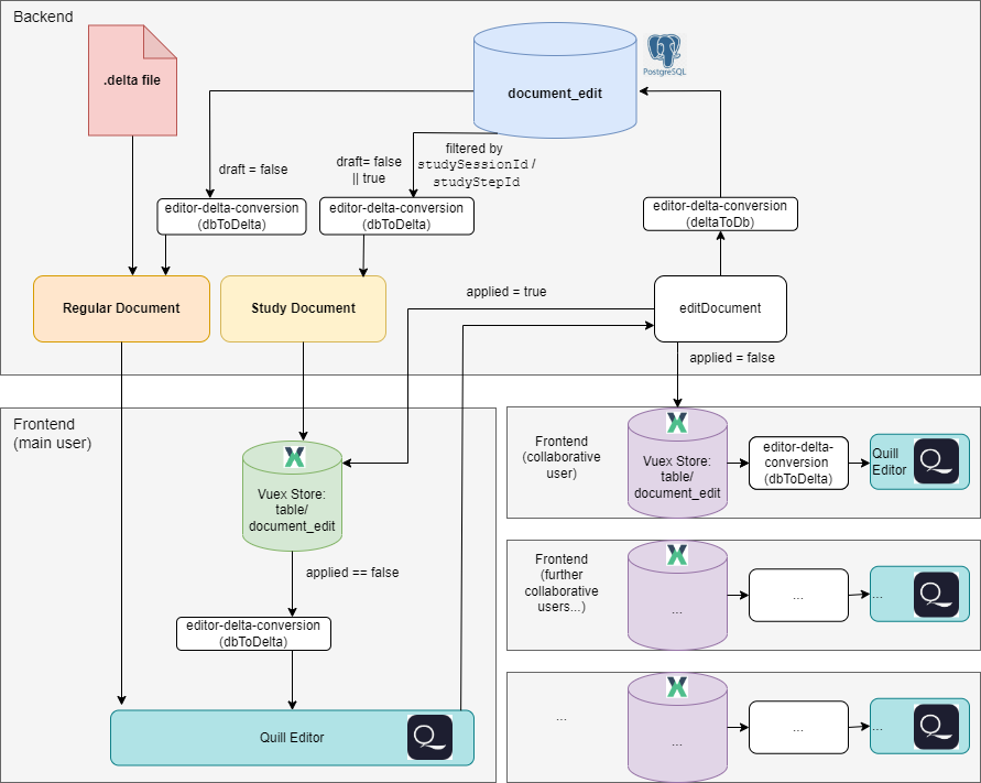 The draft entries are then passed through the dbToDelta() function (from editor-delta-conversion) to convert them into Quill-compatible operations. Both sources, the saved delta and the current drafts, are merged server-side into a single Delta. This merged result is then sent to the frontend, where the Quill editor renders the complete up-to-date view.